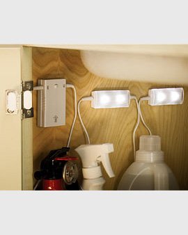 Just like a refrigerator light, this cabinet light system turns on when you open the door, turns off when you close it. Ideal for lower cabinets that dont get enough natural light. Installs in minutes with self-adhesive stickers — no drilling or hammering required. Each set comes with two long-lasting, stay-cool LED lights. Clever cabinet lighting uses energy-efficient LEDS The magnet placed on the door turns light on and off Includes main unit and two LED lights Add up to two more LED Cabinet Lights per system Uses 3 AA batteries (not included) We recommend our Envirocharger with Rechargeable Batteries