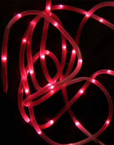 This lighting is ideal for lining buildings, windows, trees, gazebos, architectural details, stairs, deck railings, patios, boats and any other outdoor object you can think of, where you need lights using BATTERY for power, BATTERY LED Rope Lights can be placed practically anywhere without messy wires or the need of nearby outlets. The rope lights will stay illuminated for 10+ hours depending on Battery type used. Each rope lights has 50 LED lights that will make a definite night time statement, and are rated at over 100,000 hours of life. Includes Rope Light String, battery box for 3AA batteries, not included. Battery Box is 3/4" x 2"x 2 5/8" and holds 3- AA batteries. Remember the better the batteries the longer the lights will stay lit.This is one new 23 ft.-total length- of RED BATTERY LED rope lights. The lighted length is @17 ft. with a 6 ft. lead cord to place the battery box panel. The tube is 3/8" across or 1 cm. Can be used inside or outside